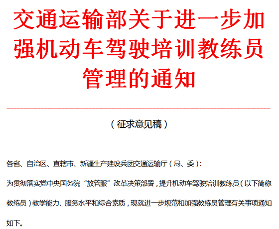 为落实国务院“放管服”改革决策部署,进一步强化事中事后监管,有效提升机动车驾驶培训教练员教学能力、服务水平和综合素质,我司组织起草了《交通运输部关于进一步加强机动车驾驶培训教练员管理的通知(征求意见稿)》,现向社会公开征求意见。