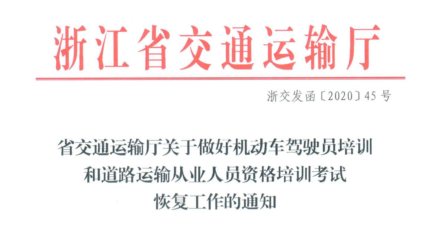 浙江省交通运输厅关于做好机动车驾驶员培训和道路运输从业人员资格培训考试恢复工作的通知,要求各地交通运输部门要指导做好机动车驾驶员培训和从业人员培训考试疫情防控和恢复工作,加强事中事后监管,确保机动车驾驶员培训和从业人员培训考试平稳有序恢复。