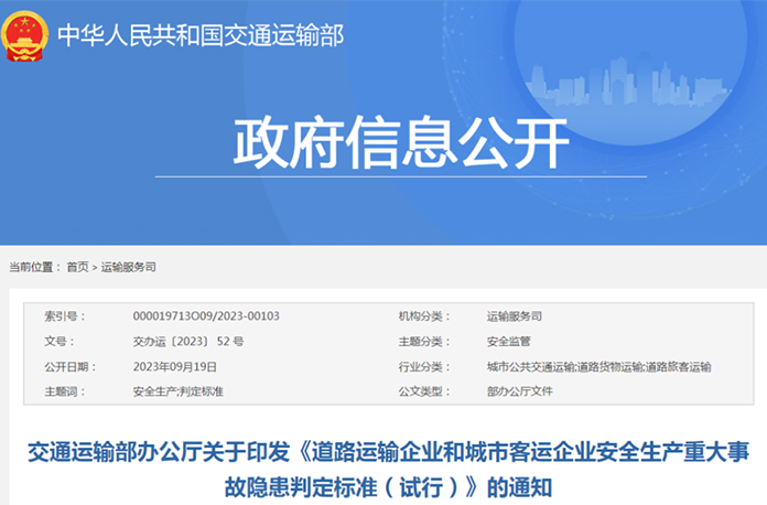 为指导各地科学判定、及时消除道路运输企业和城市客运企业安全生产重大事故隐患,根据《中华人民共和国安全生产法》《中华人民共和国道路交通安全法》《中华人民共和国道路运输条例》等法律法规,我部组织编制了《道路运输企业和城市客运企业安全生产重大事故隐患判定标准(试行)》,现印发给你们,请认真贯彻执行。