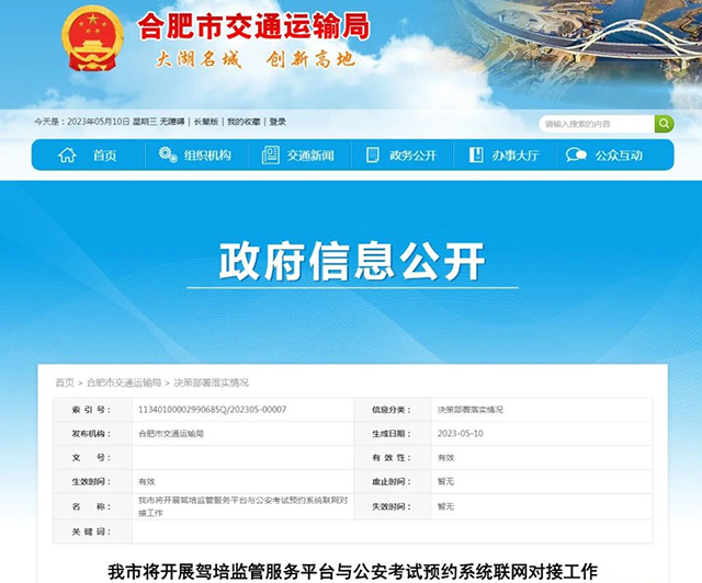 2023年7月31日前,全市驾培机构将完成安装使用符合全国统一标准的计时培训系统及车载计时设备,实现计时培训系统与监管服务平台联网。2023年11月1日起,市公安交警支队依据交通主管部门推送培训学时合格的学员信息,受理预约考试申请。