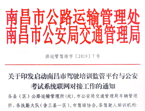 为深入贯彻落实政策文件精神,经南昌市公路运输管理处、南昌市公安局交通管理局两部门联合研究决定,在全市范围内启动驾培监管服务平台与公安考试系统联网对接工作。