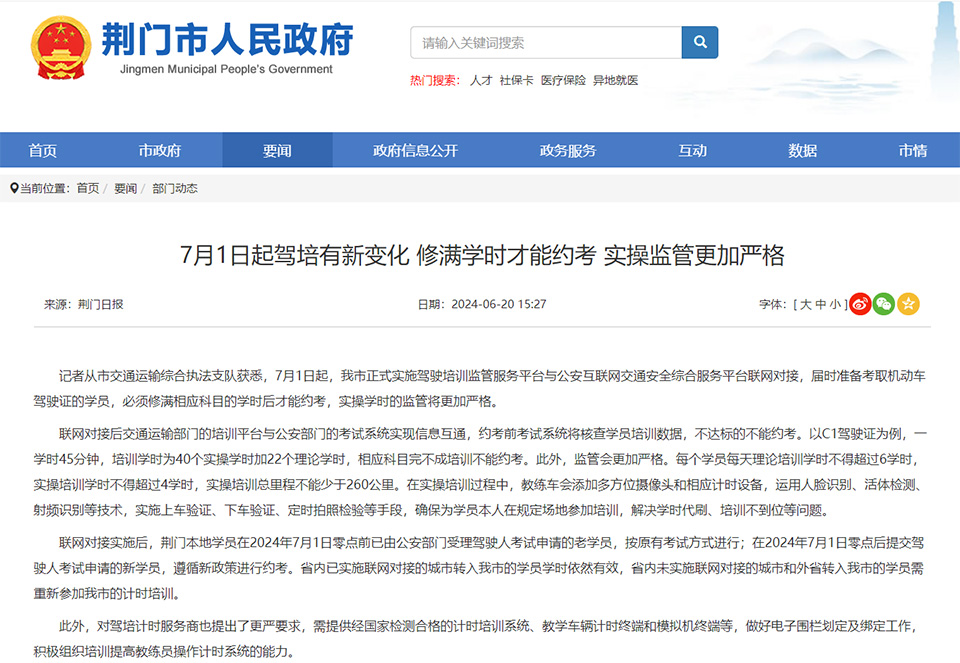前期,荆门市交通运输局、市公安局就荆门市机动车驾驶培训监管服务平台(以下简称“交通驾培监管平台”)与公安互联网交通安全综合服务平台(以下简称“交管12123平台”)联网对接工作,制订了《荆门市驾驶培训监管服务平台与公安互联网交通安全综合服务平台联网对接工作实施方案》。